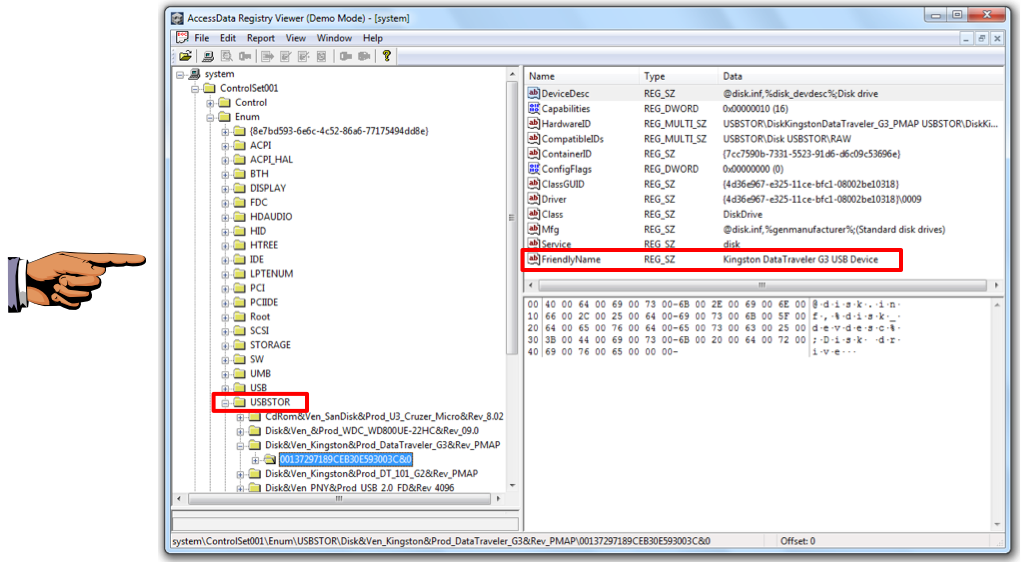 In the left pane of Registry Viewer, click the + sign to expand the USBSTOR key.