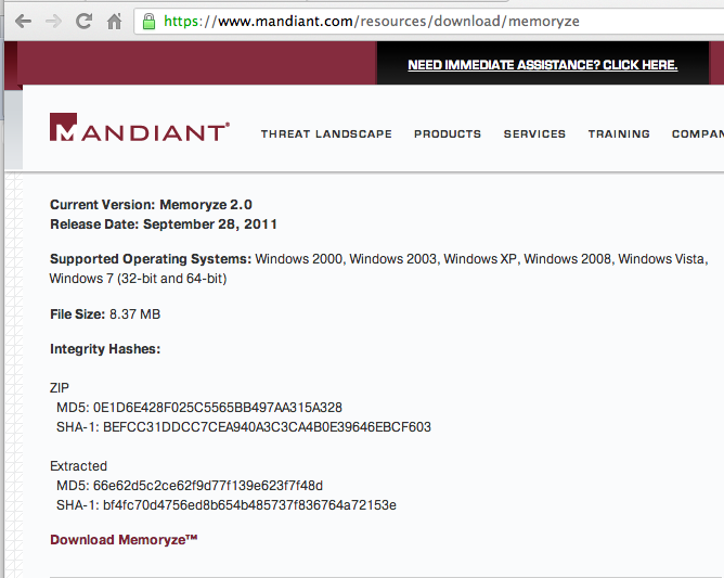 Click the "Download Memoryze" link, as shown below. Verify the hash using HashCalc or a similar tool.