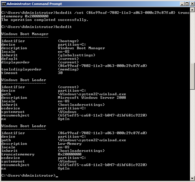 bcdedit /set {86e99eaf-7802-11e3-a063-000c29c87fa0} truncatememory 0x20000000