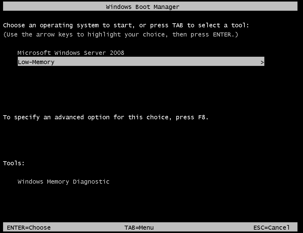 Restart the computer. A boot menu offers you two choices. Press the down-arrow key on the keyboard to select "Low-Memory", as shown below. Then press the Enter key to boot.