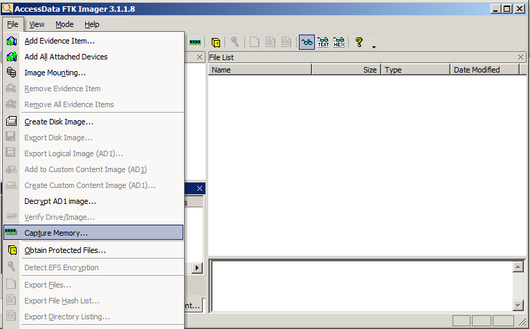 An "AccessData FTK imager 3.1.1.8" window opens. From the menu bar, click File, "Capture Memory...", as shown below: