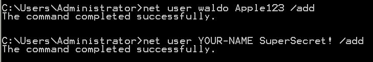 These commands create two new user accounts with the passwords "Apple123" and "SuperSecret!".