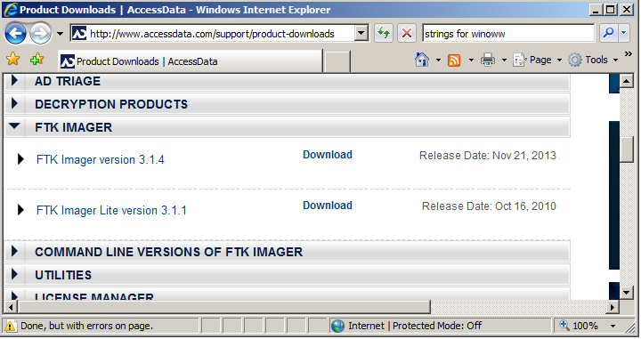 With this page open, click "FTK IMAGER" and download "FTK Imager Lite version 3.1.1" as shown below. You will have to fill in a form with your name and contact information, and approve the download. Save the "Imager_Lite_3.1.1.zip" file in your Downloads folder.