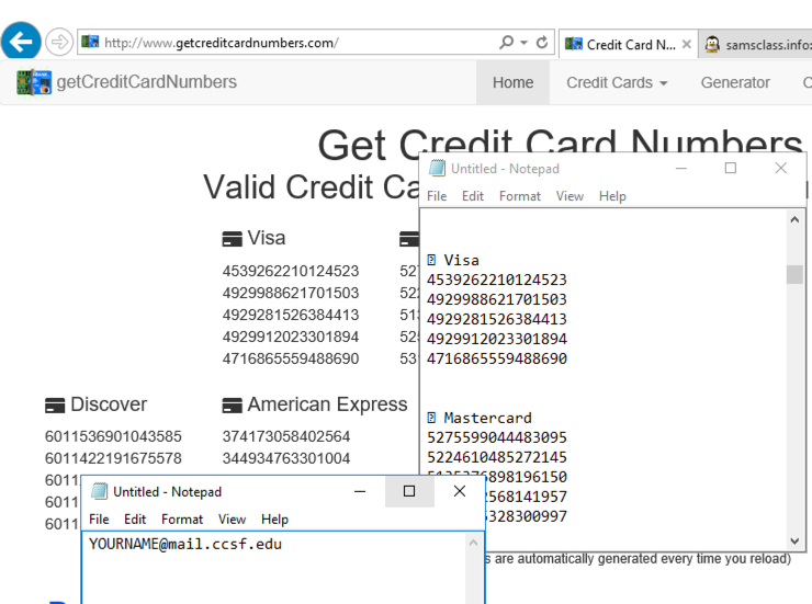 With Bing open, search for "fake credit card numbers". Open one of the pages it finds. It should show several credit card numbers, as shown below.