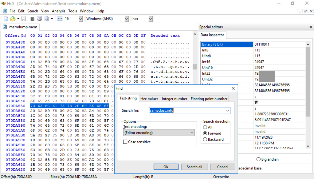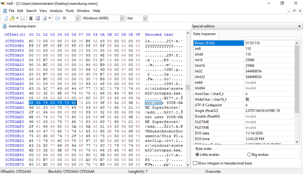 HxD finds the string and highlights it, as shown below. You can see one of the command-line commands you created when making evidence.