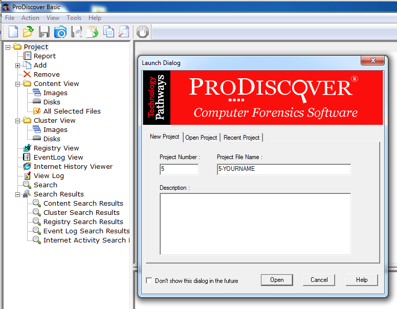 In the "Launch Dialog" box, enter a "Project Number" of 5 and a "Project File Name" of 5-YOURNAME, replacing "YOURNAME" with your own name, as shown below: