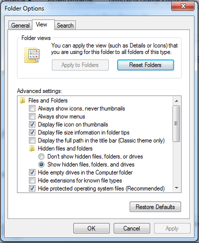 In the "Folder Options" box, click the View tab.