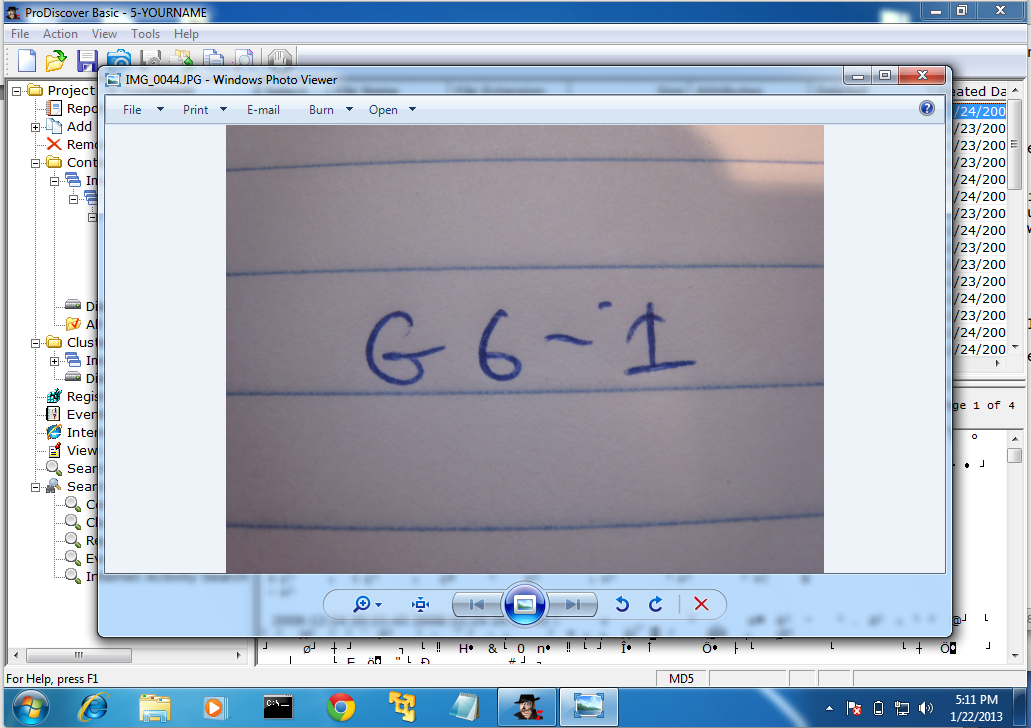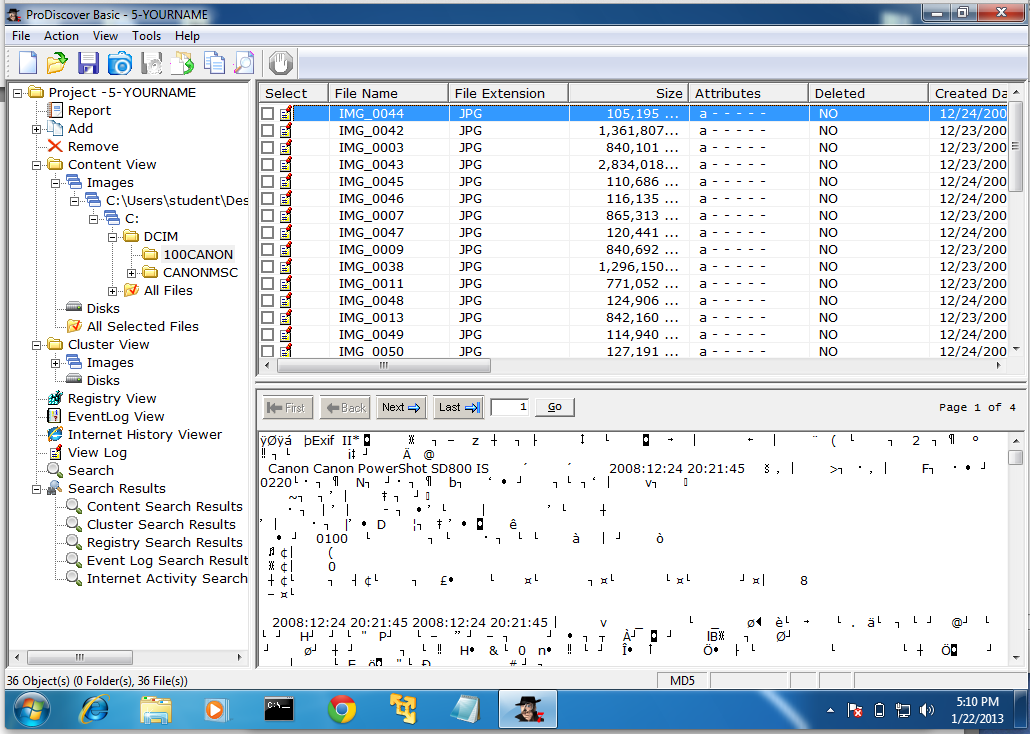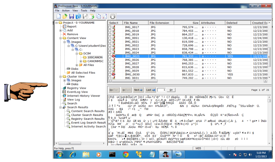 This is a deleted file, which has been recovered by ProDiscover. It's only partially recovered at this point, however. We'll do file carving in a later project.