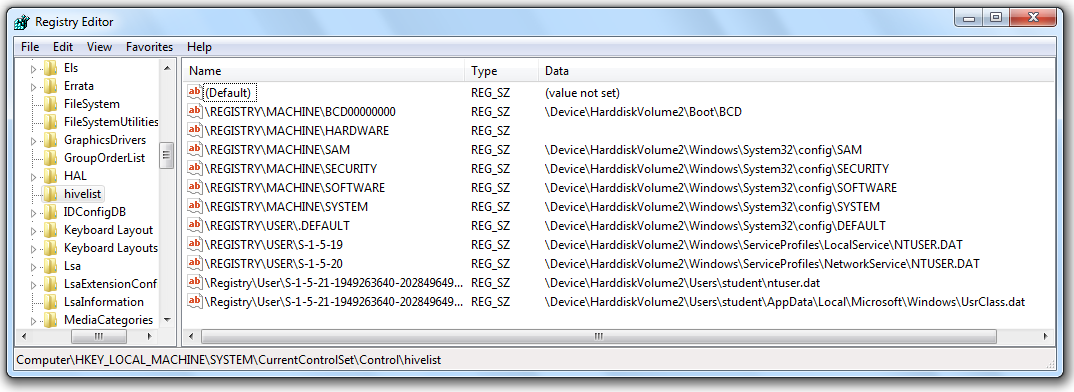 HKEY_LOCAL_MACHINE\System\CurrentControlSet\Control\HiveList