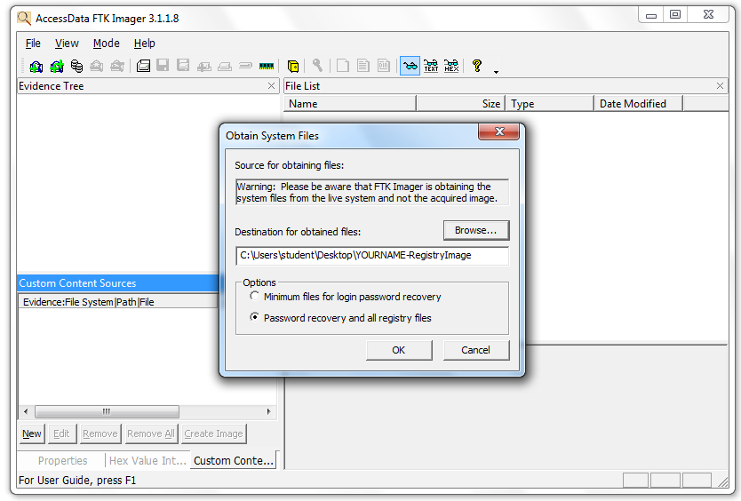 The "Obtain System Files" box opens. Notice the Warning at the top of this box. You are obtaining data from your own computer, not from an evidence image. At least one forensic examiner actually went to court and submitted data accidentally gathered from his own forensic workstation by ignoring this warning.