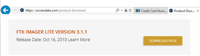 Expand the FTK Imager" section and scroll down to "FTK IMAGER LITE VERSION 3.1.1". Click the "DOWNLOAD PAGE" button, as shown below.