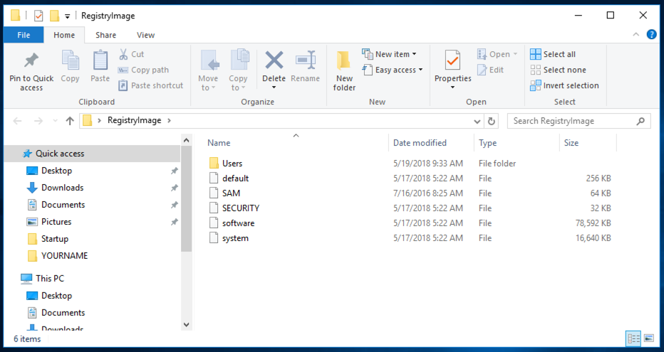 On your desktop, open the RegistryImage folder. It should contain the five files and one folder shown below. You should get used to seeing these names--they are the Hive Files, and a lot of forensics involves working with them.