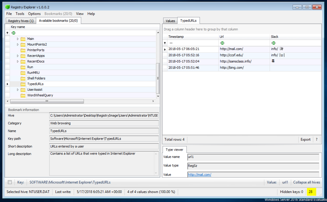 In Registry Explorer, in the top left pane, click the "Available bookmarks" tab. Scroll down and click TypedURLs.