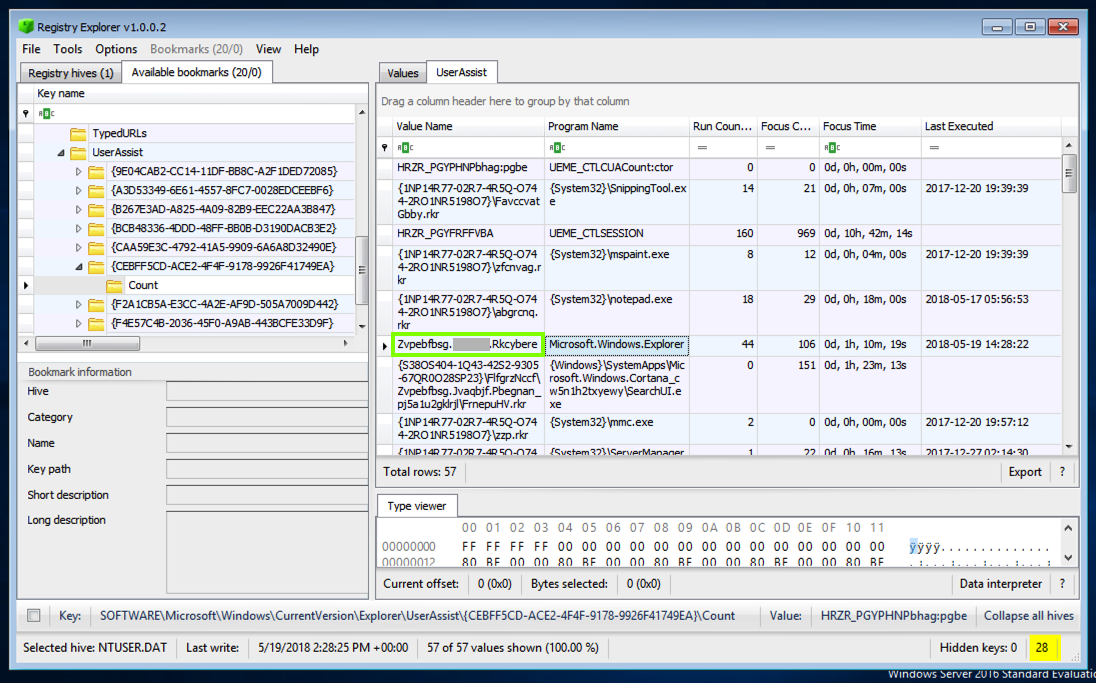 The upper right pane of Registry Explorer now shows strange unreadable "Value Name" entries. Believe it or not, these are obfuscated with ROT-13--moving each letter 13 values in the alphabet, an ancient and very weak form of encryption.