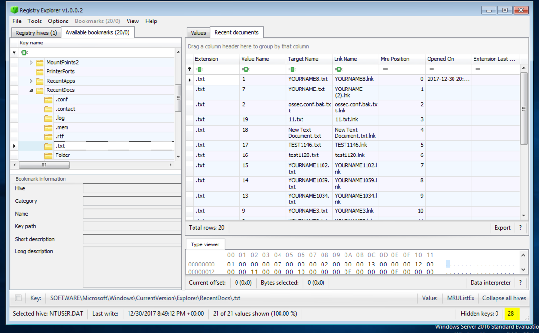 In Registry Explorer, in the top left pane, expand RecentDocs. A list of filename extensions appears. Click .txt.