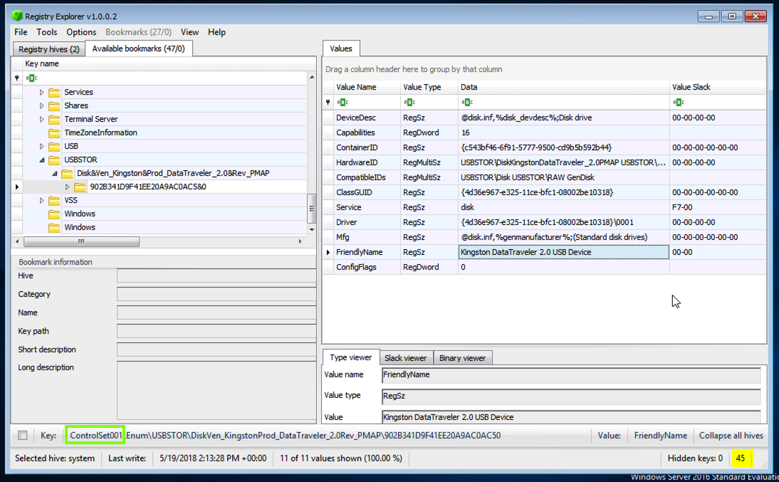 At the bottom of the Registry Explorer window, notice that it has automatically selected the correct ControlSet, as outlined in green in the image below.