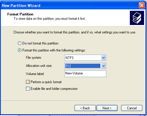 In the "Format Partition" screen, set the "Allocation unit size" to 512, as shown below, and click Next.