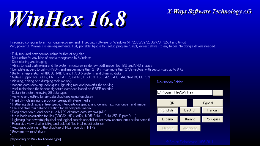 In the "WinHex 16.8" screen, in the lower right, as shown below, click the English button.