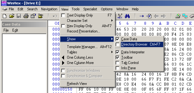 From the WinHex menu bar, click View, Show, "Directory Browser", as shown below.
