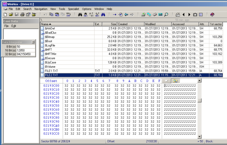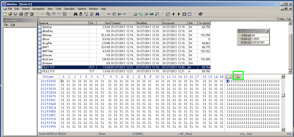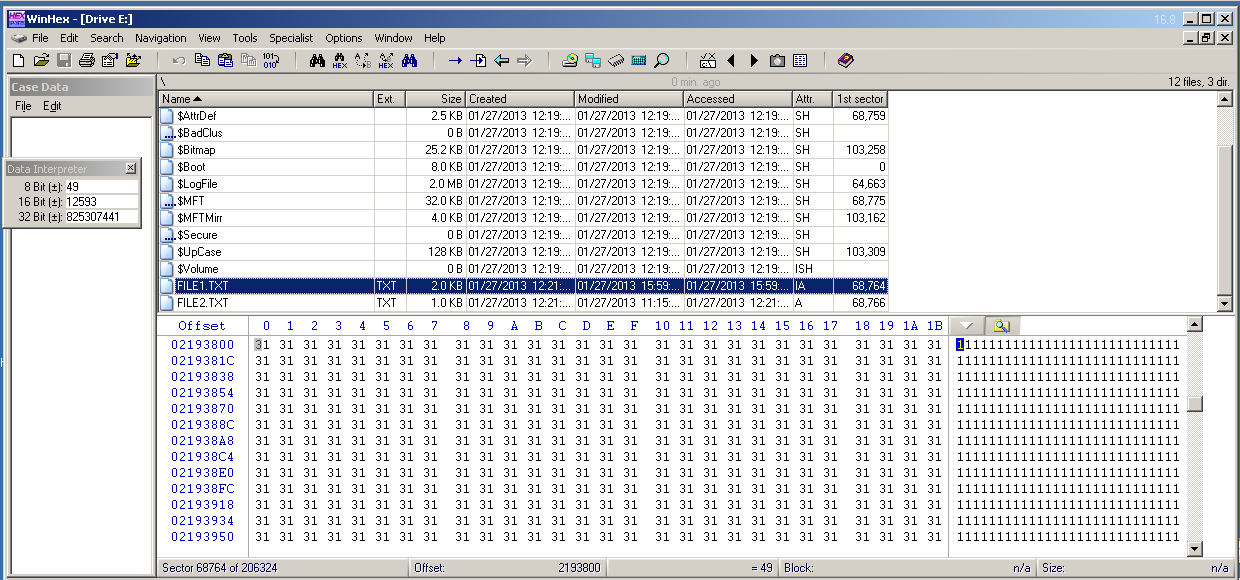 The lower pane shows the raw hex data in the first cluster containing data for FILE1.TXT, as shown below.