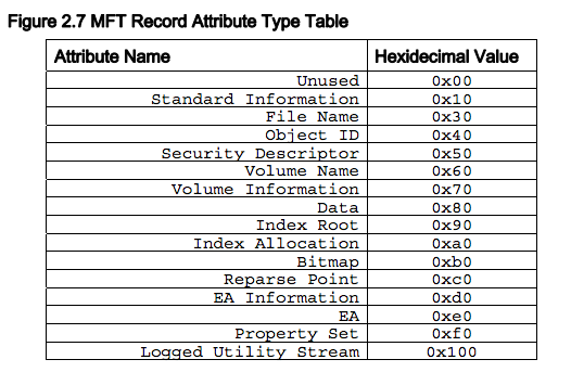Here is a chart of the MFT attribute types, from http://grayscale-research.org/new/pdfs/NTFS%20forensics.pdf