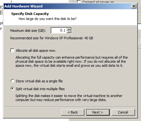 In the "Specify Disk Capacity" screen, set the Maximum disk size to 0.1 GB, as shown below.