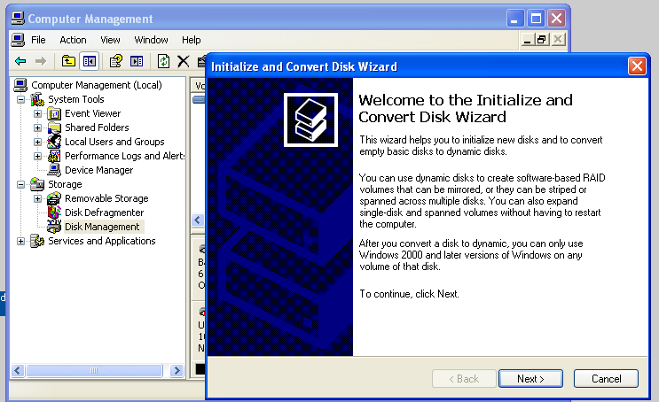 The "Initialize and Convert Disk Wizard opens, as shown below.