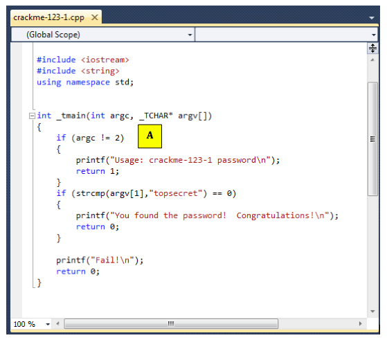 Notice the gray readable text on the right side, saying "Usage: crackme-123-1 password".