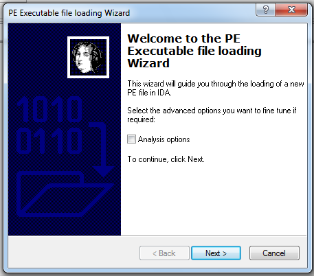 In the "Welcome to the PE Executable file loading Wizard" box, click the Next button, as shown below: