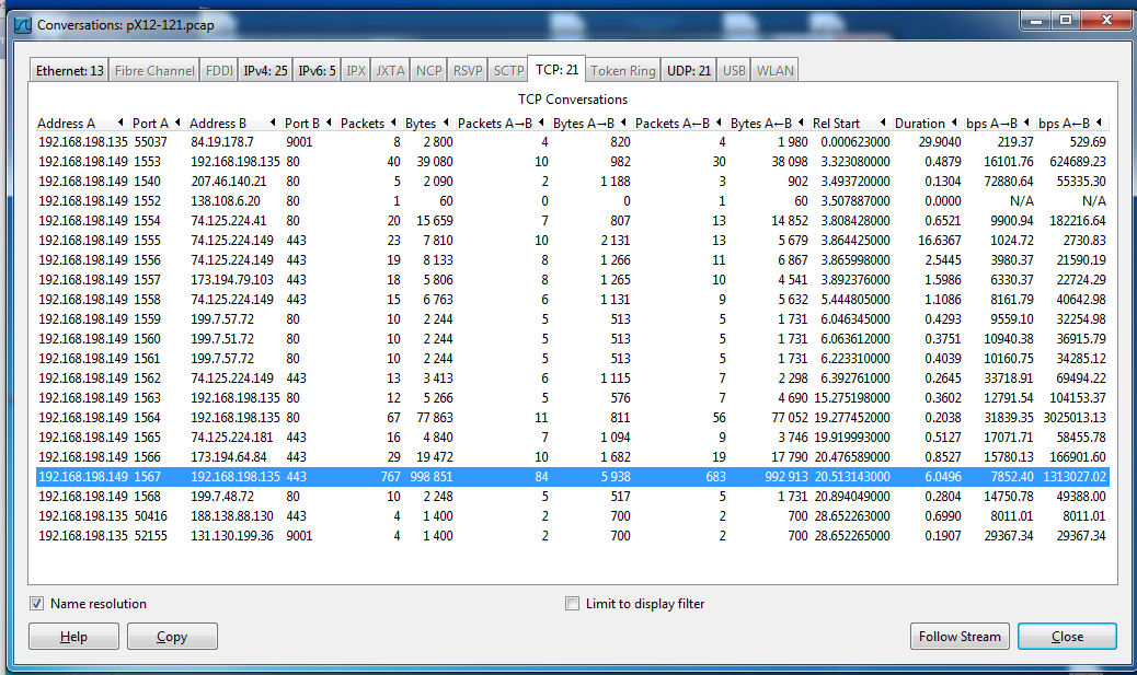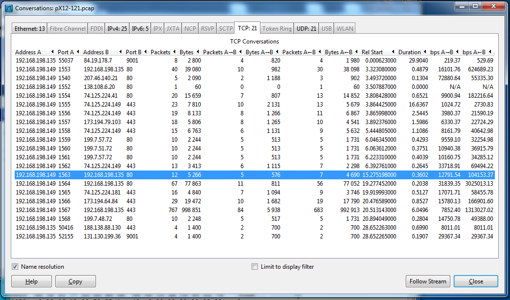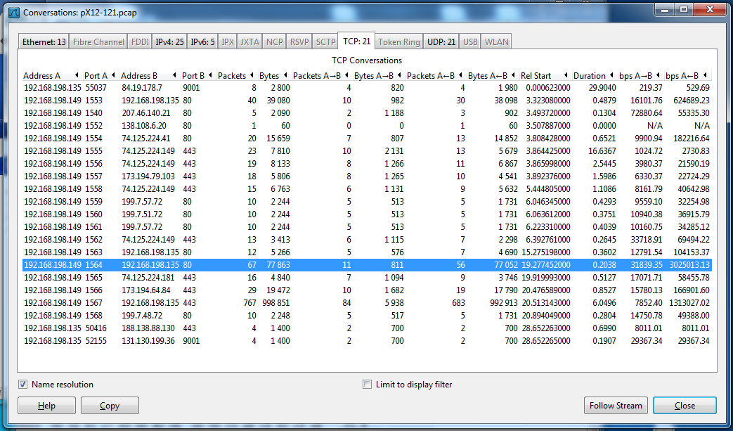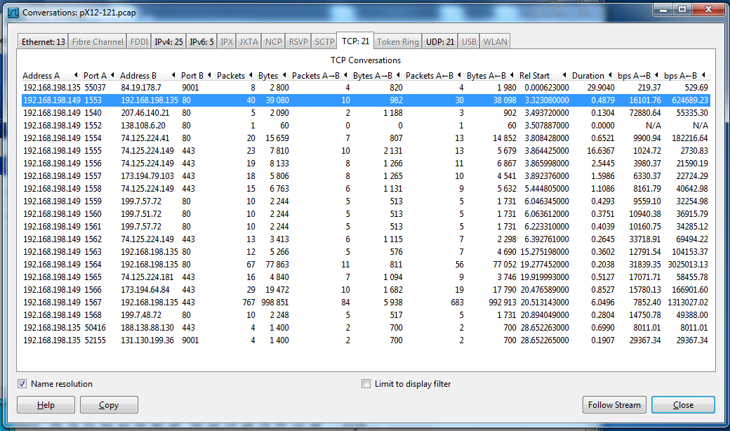 From the Wireshark menu bar, click Statistics, Conversations. In the "Conversations: pX12-121.pcap" window, click the TCP:21 tab. You see the 21 conversations in the capture, as shown below: