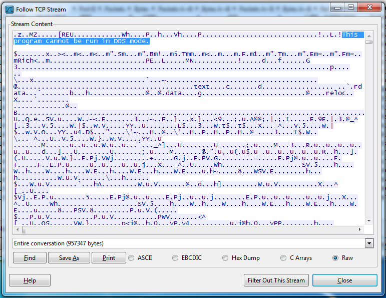 And, as you can see below, even though this traffic is coming in from port 443, it is not encrypted--you can read the usual message that indicates a Windows executable file, as shown below: