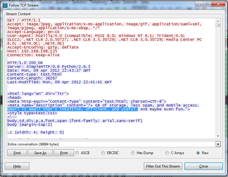 A "Follow TCP Stream" box pops up, as shown below. You can see the outgoing data in red--an HTTP GET request. The reply is in blue. This is a Gmail login page--you can see the description of the page highlighted in the image below.