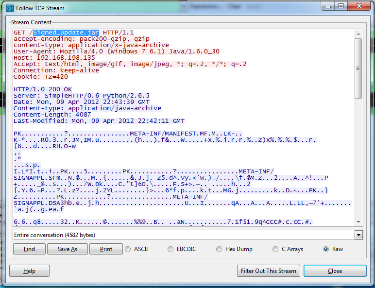 The "Follow TCP Stream" box shows a request for a file named "Signed_update.jar", as highlighted in the image below.