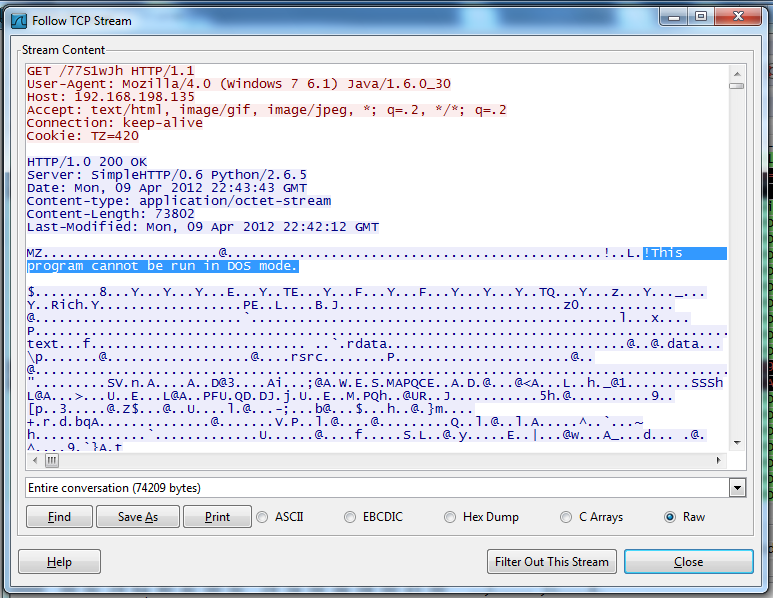 In the "Follow TCP Stream" box, click the Save As button. Save the file on your desktop as "Java-malware.jar"