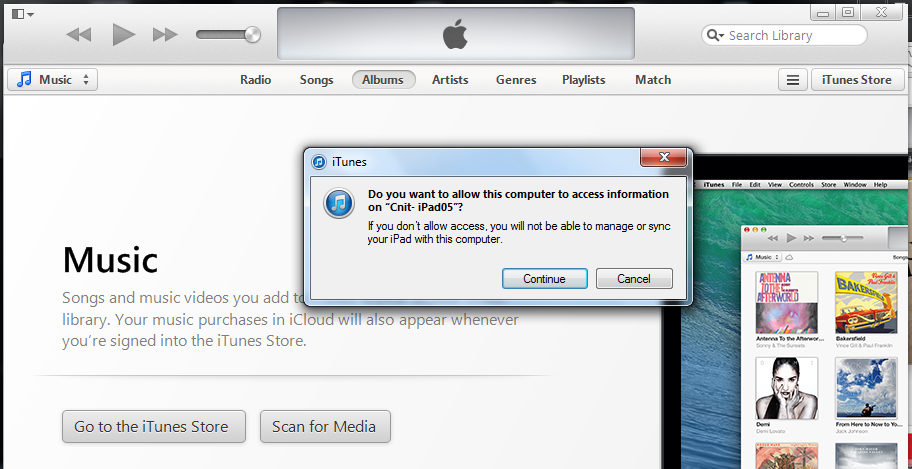 A box pops up on your computer, asking 'Do you want to allow this computer to access information on "Cnit-iPad05"?', as shown below.