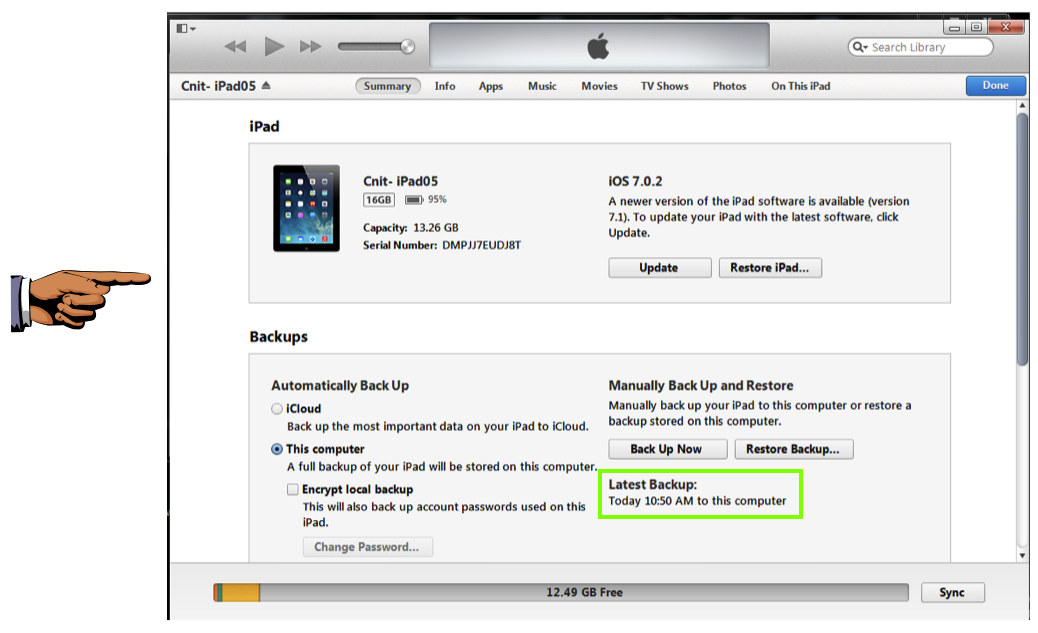 On the next page, in the "Backups" section, you should see a message saying "Latest Backup", showing that the iPad automatically backed up when you plugged it in. If that did not automatically happen, click "Back Up Now".