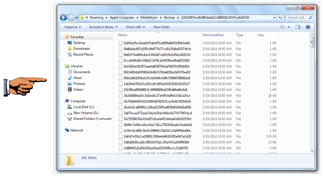 Double-click that folder to open it. It contains a lot of files with hexadecimal names and no filename extensions, as shown below.
