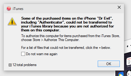 If you see the message below saying some files could not be backed up, just click OK to accept an incomplete backup, or press the Alt key to display the menu bar in iTunes and click Store, "Authorize this Computer...". to get a complete backup.