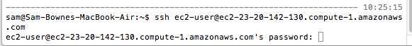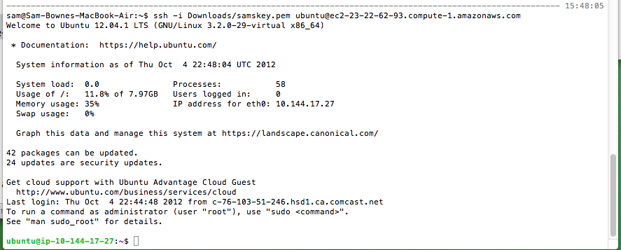 ssh -i Downloads/samskey.pem ec2-user@ec2-23-20-142-130.compute-1.amazonaws.com