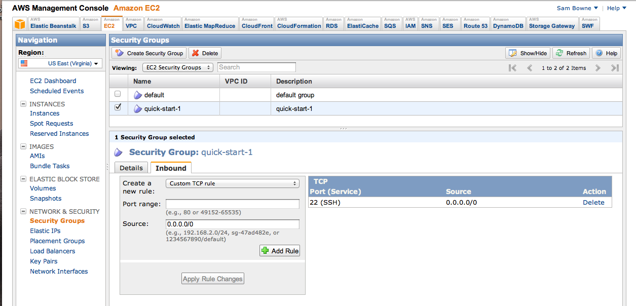On the next page, on the right side, you can see that your Instance is in the Security Group "quick-start1", as shown below: