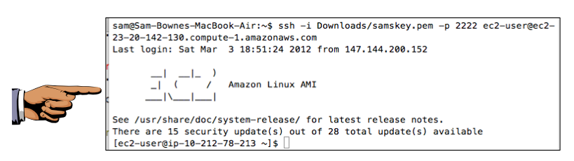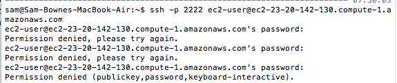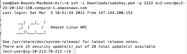 ssh -i Downloads/samskey.pem -p 2222 ec2-user@ec2-23-20-142-130.compute-1.amazonaws.com