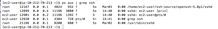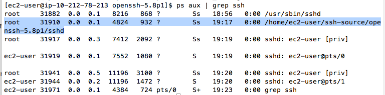 You should see a line labelled /home/ec2-user/ssh-source/openssh-5.8p1/sshd,