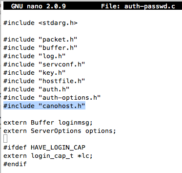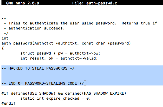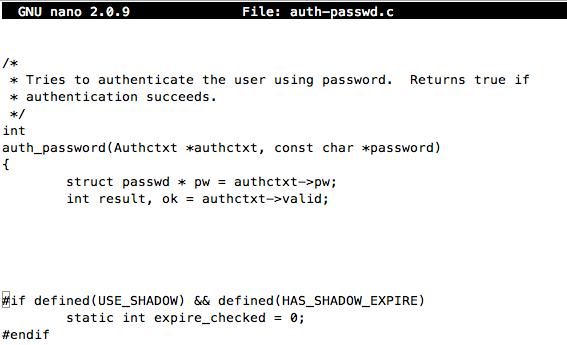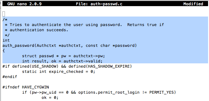 Move the cursor to the end of the "int result, ok = authctxt->valid;" line, and press the Enter key several times to make some whitespace, as shown below: