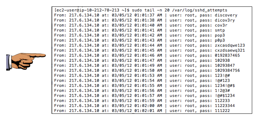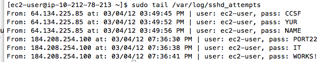 Before long, you should see names and passwords from automated attacks. I got my first attacks 5.5 hours after setting up the honeypot.