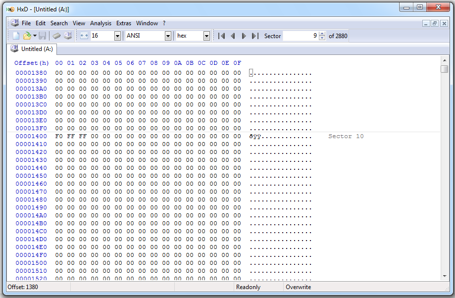 HxD also shows that all the sectors between 1 and 10 are empty--filled with 00 bytes.