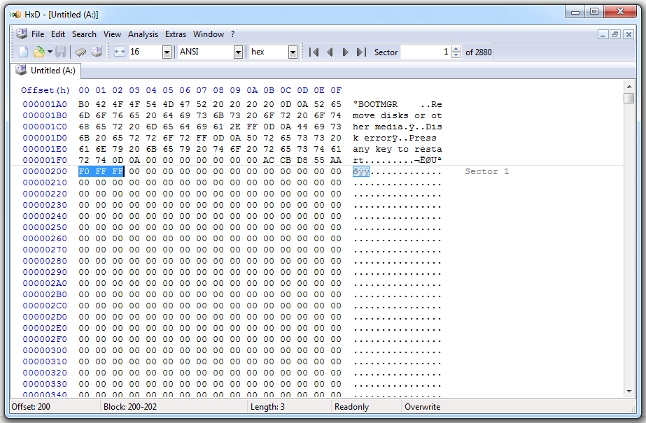 Here's the second sector--the start of the FAT. It begins with the three bytes F0 FF FF, as explained here: