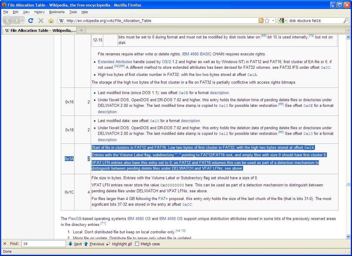 The directory structure for FAT-16 shows that the starting cluster is at an offset of 0x1a, starting from the first character in the filename: