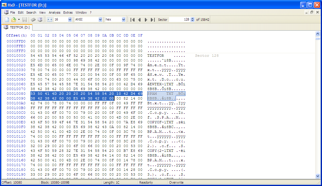 The directory entry for the SPAM.TXT file starts at byte 10080 with the file name.