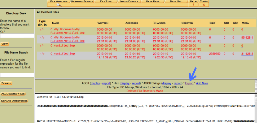 To recover the deleted file, in the center right, click the blue Export link, indicated by the blue arrow in the image above.