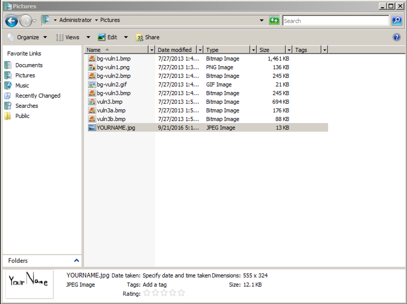 Save the file in your Pictures folder with the name "YOURNAME". Don't use the literal text "Your Name"--use your own name. Accept the default File Type of JPG.